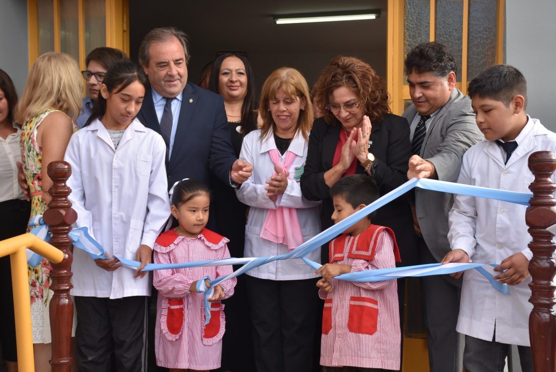 El vicegobernador Alberto Bernis, la ministra Miriam Serrano y el intendente Luciano Moreira encabezaron el acto que comenzó con el corte de cintas y el descubrimiento de una placa recordatoria junto a la presidente de la Comisión de Educación de la Legislatura, María Ferrín, y la directora del establecimiento, Claudia Dolsán.