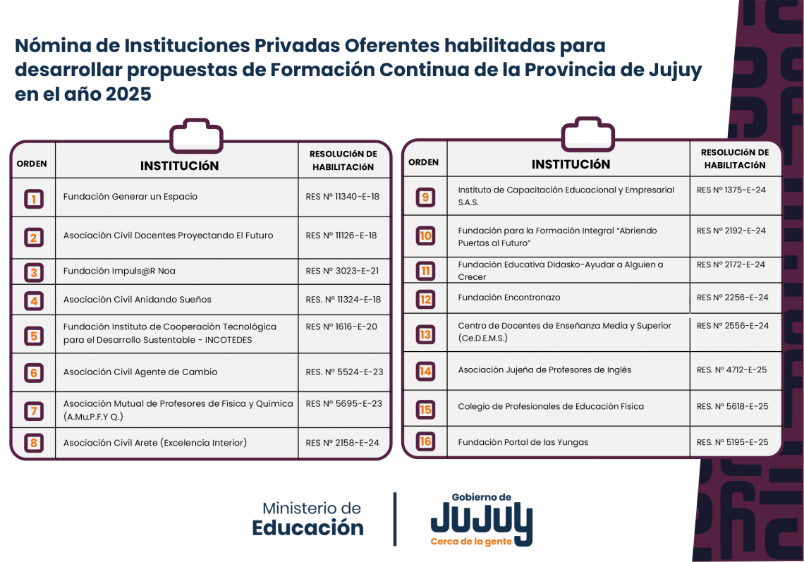 El Ministerio de Educación de la Provincia de Jujuy, a través de la Unidad de Formación Continua de Instituciones Oferentes dependiente de la Secretaría de Planeamiento Estratégico, informa a la comunidad educativa la nómina actualizada de las Instituciones Privadas habilitadas para ofrecer propuestas de Formación Continua en el año 2025.