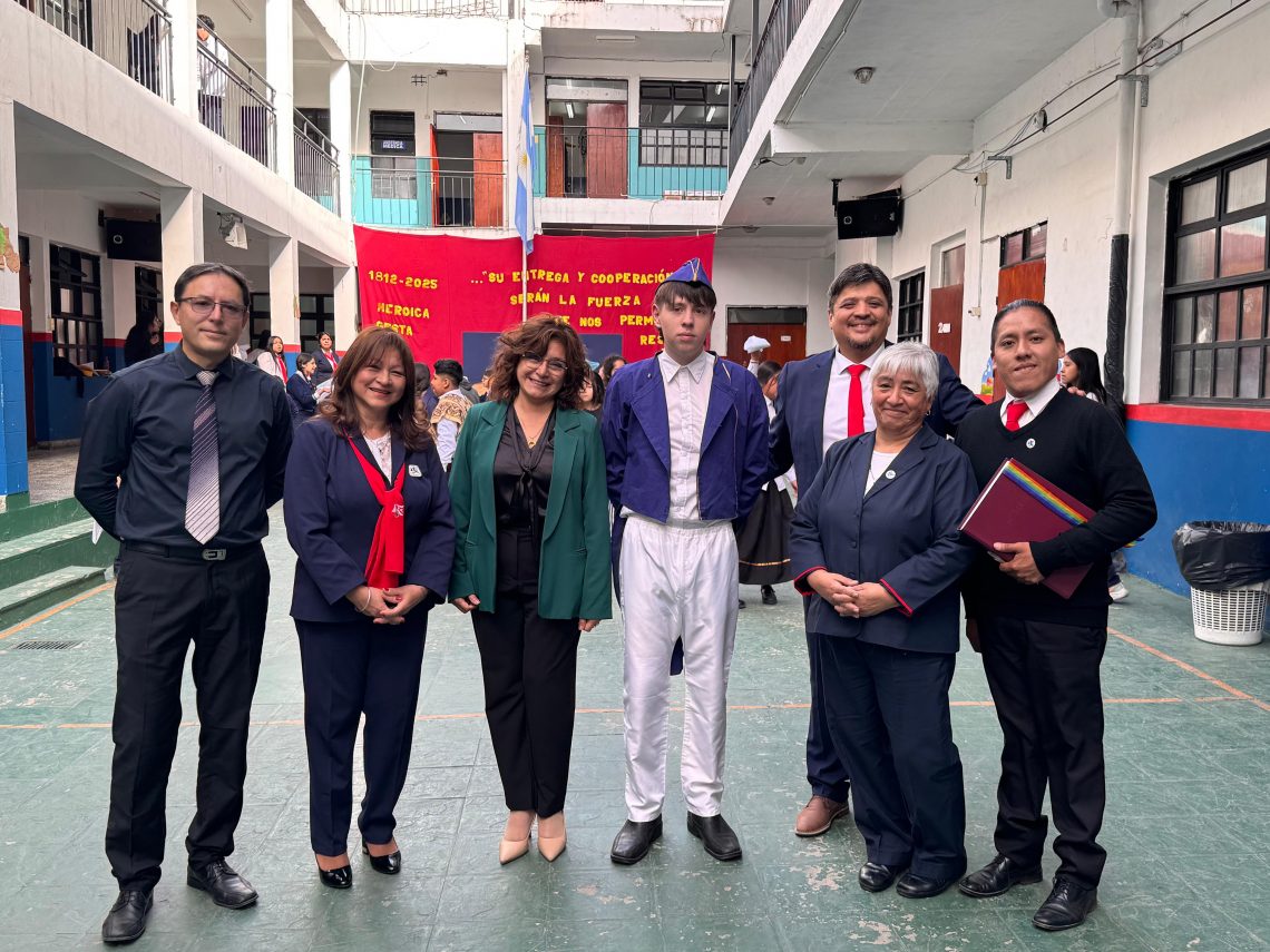 La ministra se reunió con el equipo directivo y luego saludó a los estudiantes que se preparaban para el acto homenaje a la Gesta Heroica del Éxodo Jujeño.