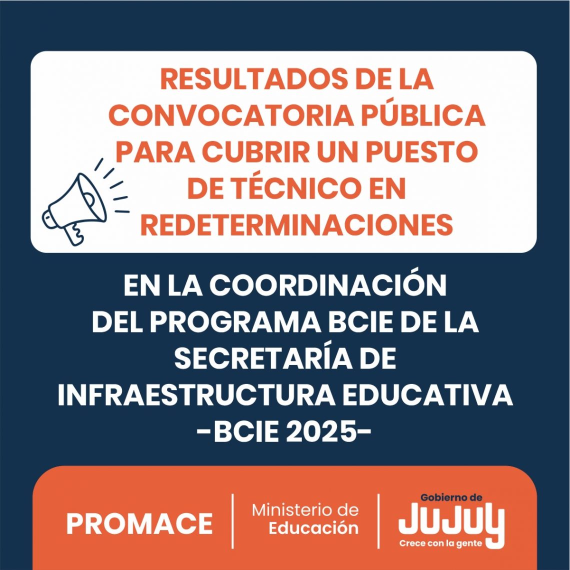 El Ministerio de Educación, a través de la Coordinación del Programa BCIE de la Secretaría de Infraestructura Educativa, informa que ha finalizado el proceso de evaluación correspondiente a la Convocatoria Pública para cubrir el puesto de Técnico en Redeterminaciones, en el marco del Programa de Mejora del Acceso y la Calidad Educativa – PROMACE, financiado por el Banco Centroamericano de Integración Económica (BCIE).