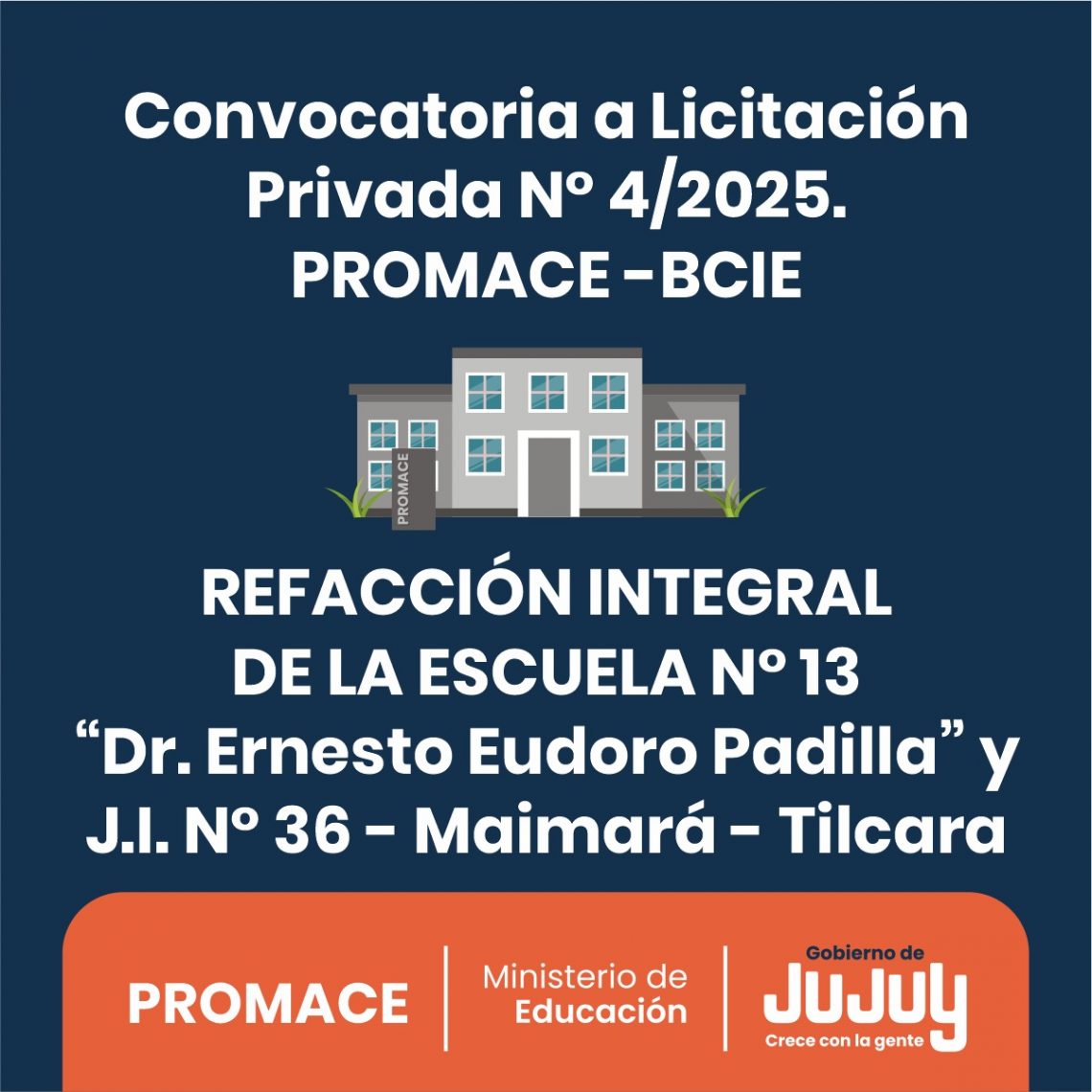 La licitación tiene como objetivo la contratación de la obra de “REFACCIÓN INTEGRAL DE LA ESCUELA N° 13 ‘DR. ERNESTO EUDORO PADILLA’ Y ‘J.I. N° 36′”. La escuela está ubicada en la localidad de Maimará, en el Departamento de Tilcara. El proyecto se enmarca en el PROMACE y se financia con aporte local del préstamo del BCIE.