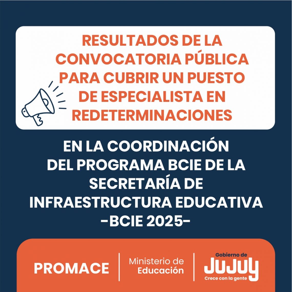 La Secretaría de Infraestructura Educativa, a través de la Coordinación del Programa BCIE, informa que ha finalizado el proceso de evaluación correspondiente a la Convocatoria Pública para cubrir el puesto de Especialista en Redeterminaciones, en el marco del Programa de Mejora del Acceso y la Calidad Educativa – PROMACE, financiado por el Banco Centroamericano de Integración Económica (BCIE).
