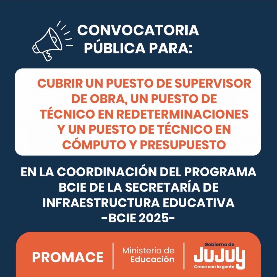 La Coordinación del Programa BCIE dependiente de la Secretaría de Infraestructura Educativa convoca a participar de la evaluación para cubrir un puesto de “Supervisor/a de Obras”, un puesto de “Técnico en Redeterminaciones” y un puesto de “Técnico en Cómputo y Presupuesto”, a fin de desempeñar funciones en la misma, en el marco del Programa de Mejora del Acceso y la Calidad Educativa PROMACE, según los Términos de Referencia de Contratación, acordados conjuntamente entre el Ministerio de Educación y el Banco Centroamericano de Integración Económica (BCIE).