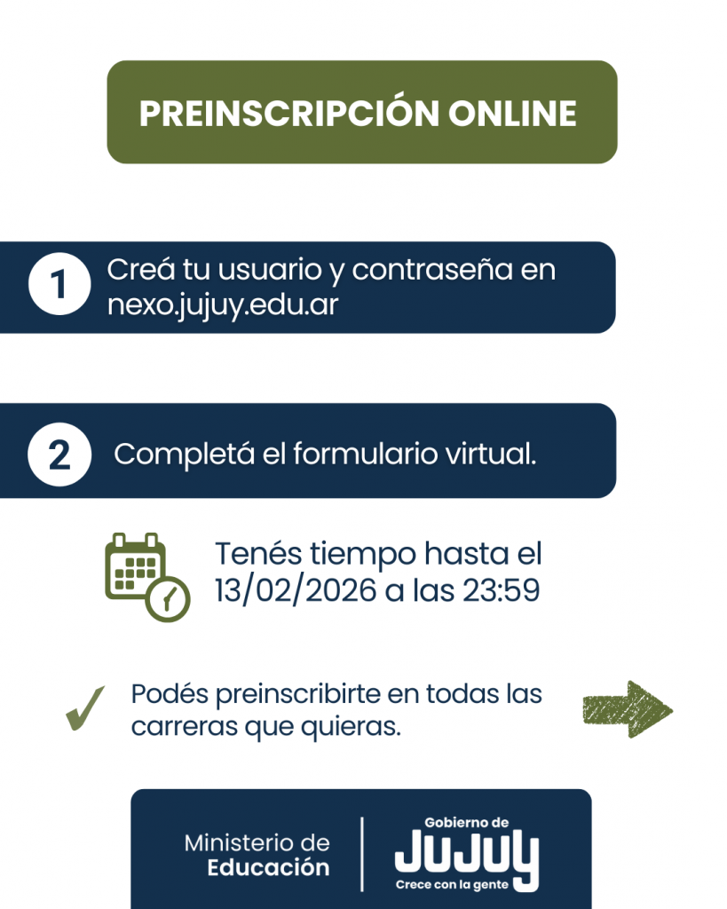 Para realizar la preinscripción, los aspirantes deben crear un usuario en nexo.jujuy.edu.ar. El formulario virtual estará habilitado hasta las 23:59 horas de la mencionada fecha. En esta etapa no se establecen cupos por carrera ni se limita la cantidad de ofertas educativas a las que una persona puede inscribirse.