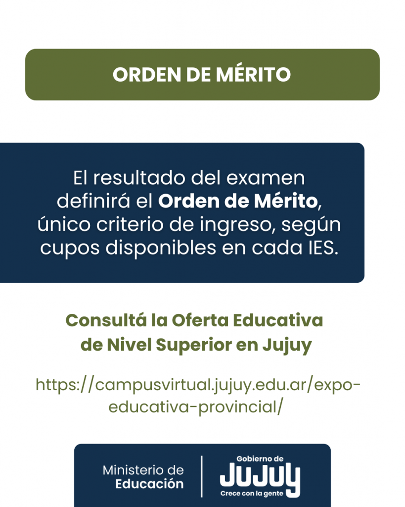 El cursillo contará con una evaluación final presencial y obligatoria para todos los aspirantes. El resultado del examen definirá el Orden de Mérito, único criterio para el ingreso a las carreras, según los cupos disponibles en cada IES.