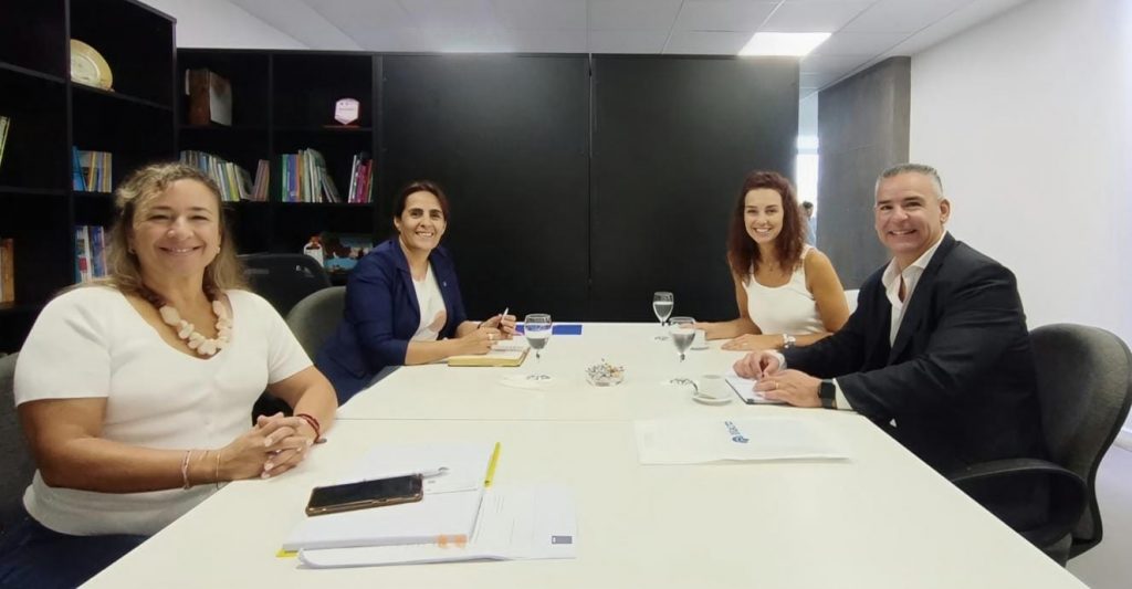La ministra de Educación, Daniela Tesseira, recibió al presidente de la Cámara Jujeña de la Construcción, Nicolás Benicio, en un encuentro de trabajo del que también participaron la asesora pedagógica ministerial Marcela Gámez, el asesor legal y técnico Fernando Aparicio y el secretario de Infraestructura Educativa Matías Torcivia.